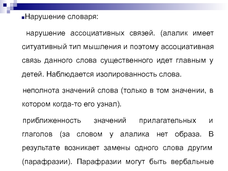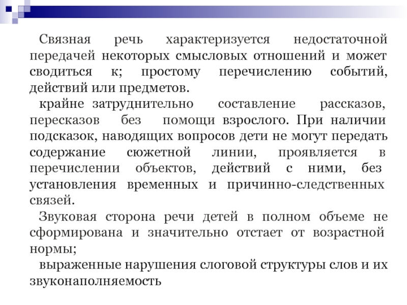 Слайд 6Связная речь характеризуется недостаточной передачей некоторых смысловых отношений и может