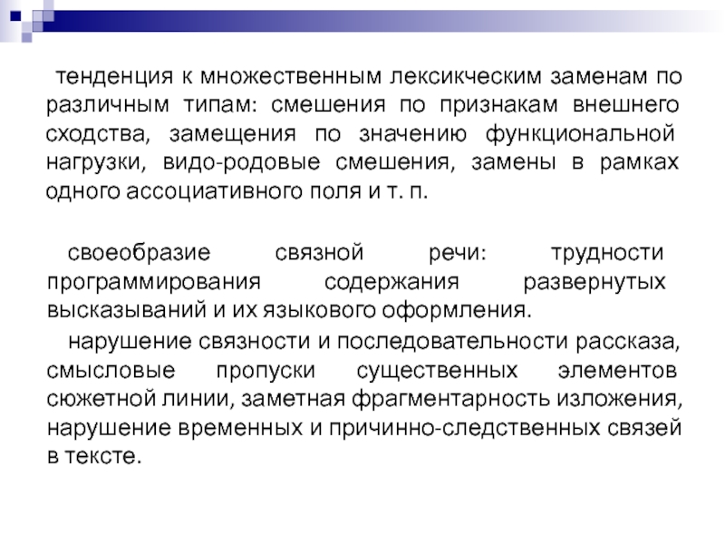 нарушение связности и последовательности рассказа, смысловые пропуски существенных элементов сюжетной линии, заметная фрагментарность изложения, нарушение временных и причинно-следственных связей в тексте.