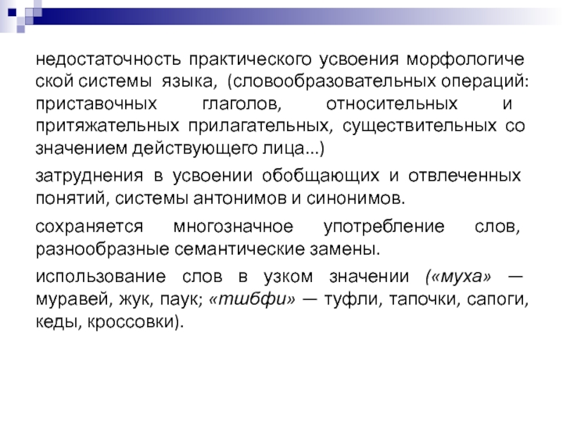 Слайд 5недостаточность практического усвоения морфологической системы языка, (словообразовательных операций: приставочных глаголов,