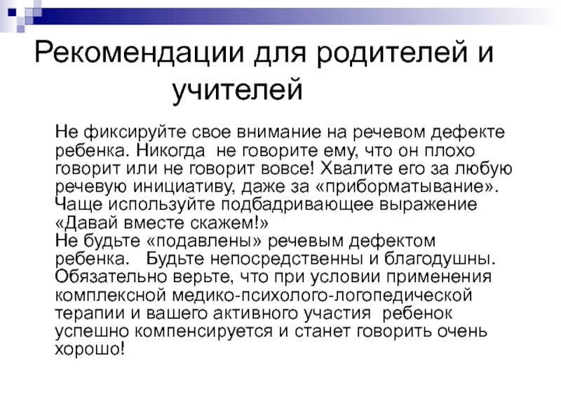 Не будьте «подавлены» речевым дефектом ребенка. Будьте непосредственны и благодушны. Обязательно верьте, что при условии применения комплексной медико-психолого-логопедической терапии и вашего активного участия ребенок успешно компенсируется и станет говорить очень хорошо!