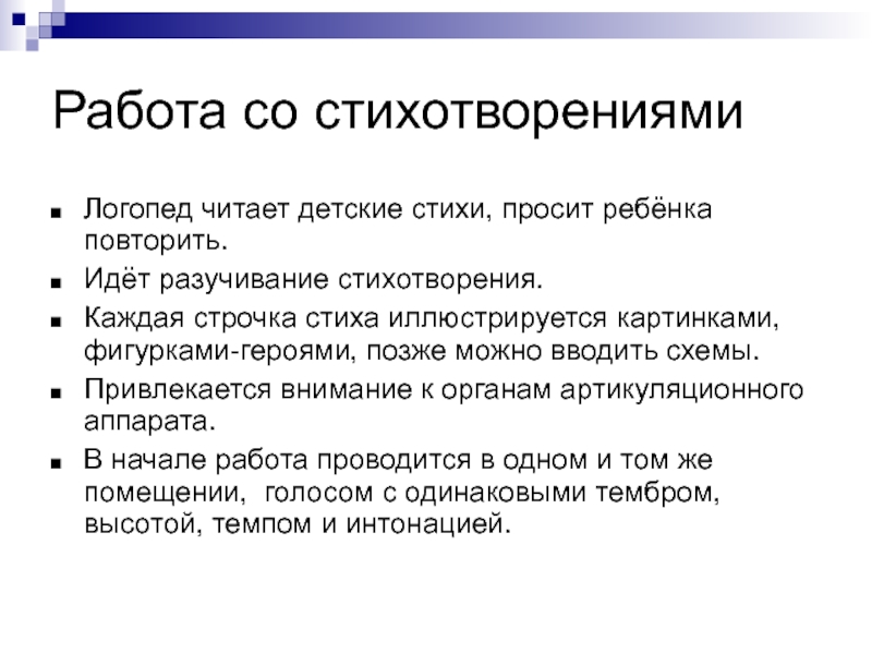 сказки, рассказы Осевой, Толстова, Ушинского, Сутеева, стихи Чуковского, Барто, Михалкова). На первых этапах говорит только логопед.