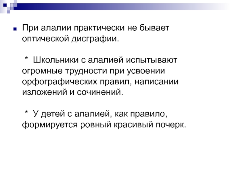 Слайд 70При алалии практически не бывает оптической дисграфии.