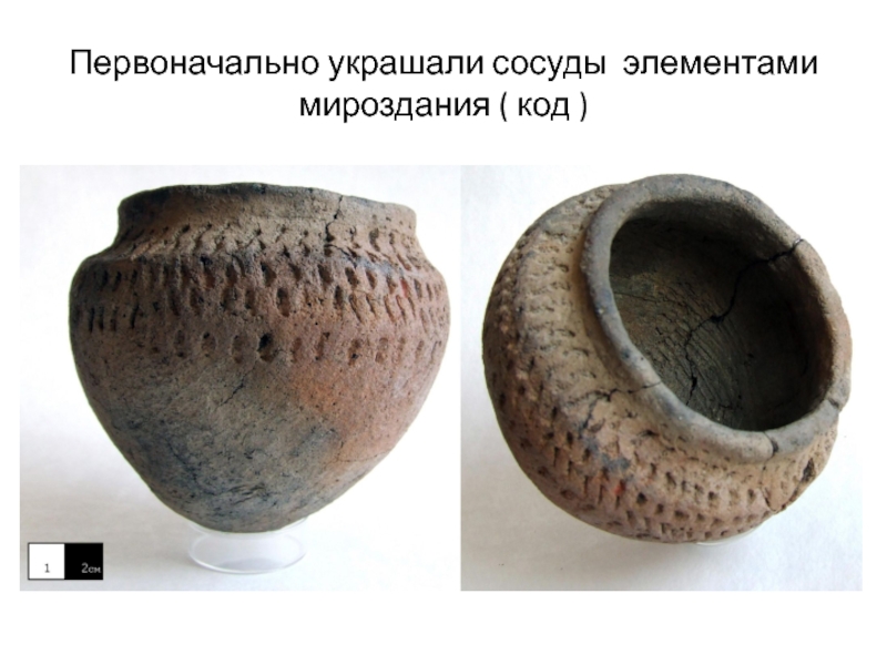 Слайд 26Первоначально украшали сосуды элементами мироздания ( код )