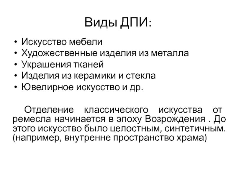 Виды ДПИ:Искусство мебелиХудожественные изделия из металлаУкрашения тканейИзделия из керамики и стеклаЮвелирное искусство и др. 	Отделение классического искусства