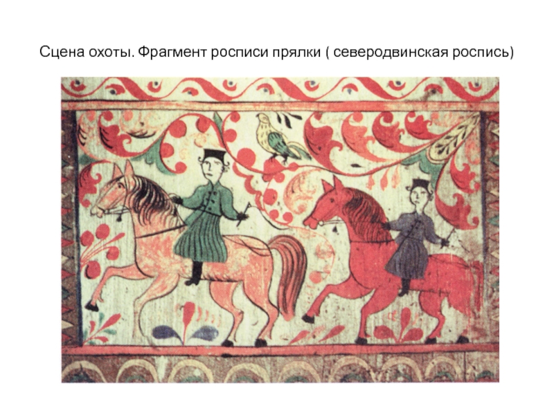 Слайд 7Сцена охоты. Фрагмент росписи прялки ( северодвинская роспись)