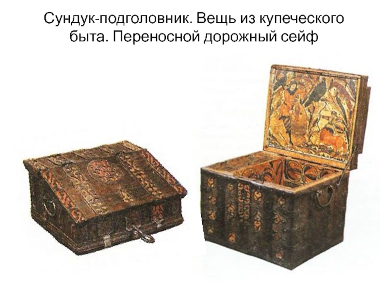 Слайд 13Сундук-подголовник. Вещь из купеческого быта. Переносной дорожный сейф