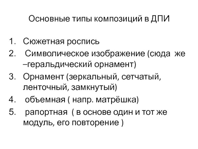 Основные типы композиций в ДПИСюжетная роспись Символическое изображение (сюда же –геральдический орнамент)Орнамент (зеркальный, сетчатый, ленточный, замкнутый) объемная