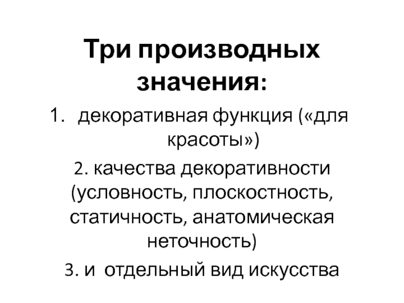 Три производных значения:декоративная функция («для красоты»)2. качества декоративности (условность, плоскостность, статичность, анатомическая неточность)3. и отдельный вид искусства