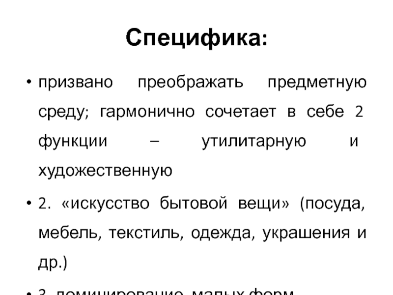 Специфика: призвано преображать предметную среду; гармонично сочетает в себе 2 функции – утилитарную и художественную2. «искусство бытовой