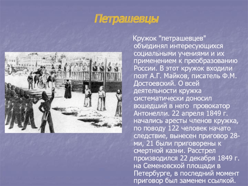 Майков, писатель Ф.М. Достоевский. О всей деятельности кружка систематически доносил вошедший в него провокатор Антонелли. 22 апреля 1849 г. начались аресты членов кружка, по поводу 122 человек начато следствие, вынесен приговор 28-ми, 21 были приговорены к смертной казни. Расстрел производился 22 декабря 1849 г. на Семеновской площади в Петербурге, в последний момент приговор был заменен ссылкой.