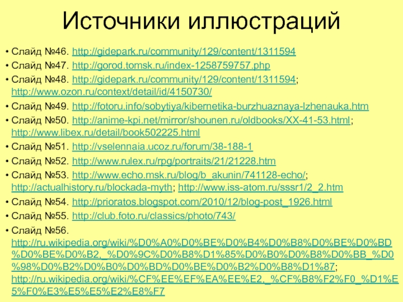 Слайд №56. http://ru.wikipedia.org/wiki/%D0%A0%D0%BE%D0%B4%D0%B8%D0%BE%D0%BD%D0%BE%D0%B2,_%D0%9C%D0%B8%D1%85%D0%B0%D0%B8%D0%BB_%D0%98%D0%B2%D0%B0%D0%BD%D0%BE%D0%B2%D0%B8%D1%87; http://ru.wikipedia.org/wiki/%CF%EE%EF%EA%EE%E2,_%CF%B8%F2%F0_%D1%E5%F0%E3%E5%E5%E2%E8%F7