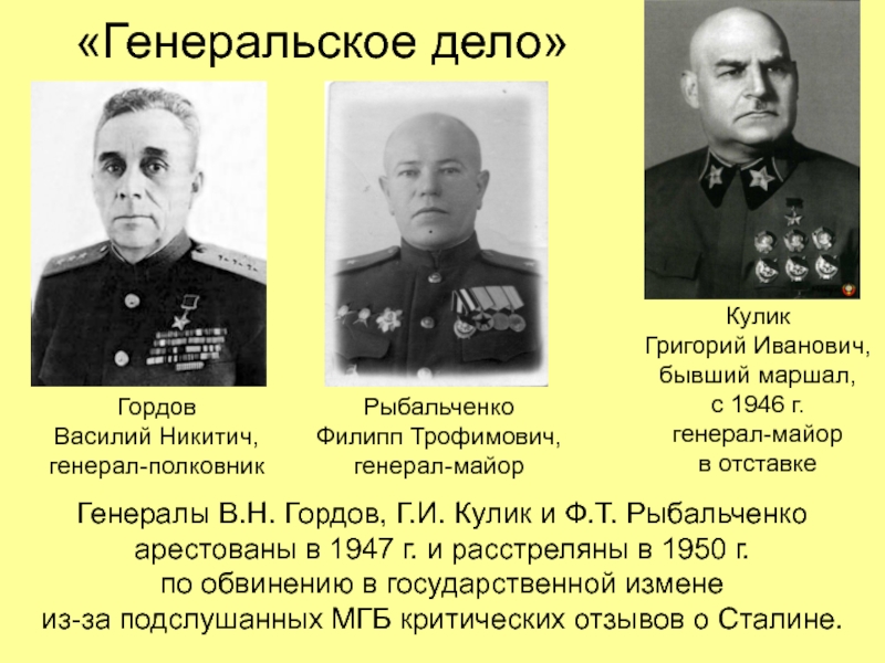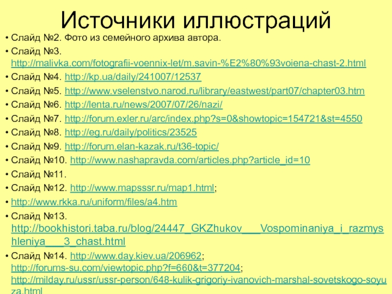 Слайд №14. http://www.day.kiev.ua/206962; http://forums-su.com/viewtopic.php?f=660&t=377204; http://milday.ru/ussr/ussr-person/648-kulik-grigoriy-ivanovich-marshal-sovetskogo-soyuza.html