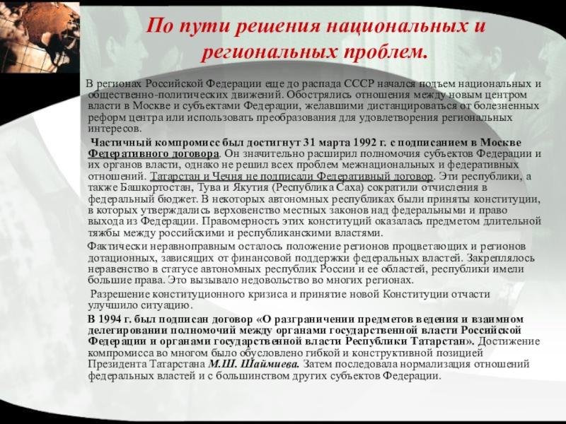 В 1994 г. был подписан договор «О разграничении предметов ведения и взаимном делегировании полномочий между органами государственной власти Российской Федерации и органами государственной власти Республики Татарстан». Достижение компромисса во многом было обусловлено гибкой и конструктивной позицией Президента Татарстана М.Ш. Шаймиева. Затем последовала нормализация отношений федеральных властей и с большинством других субъектов Федерации.
