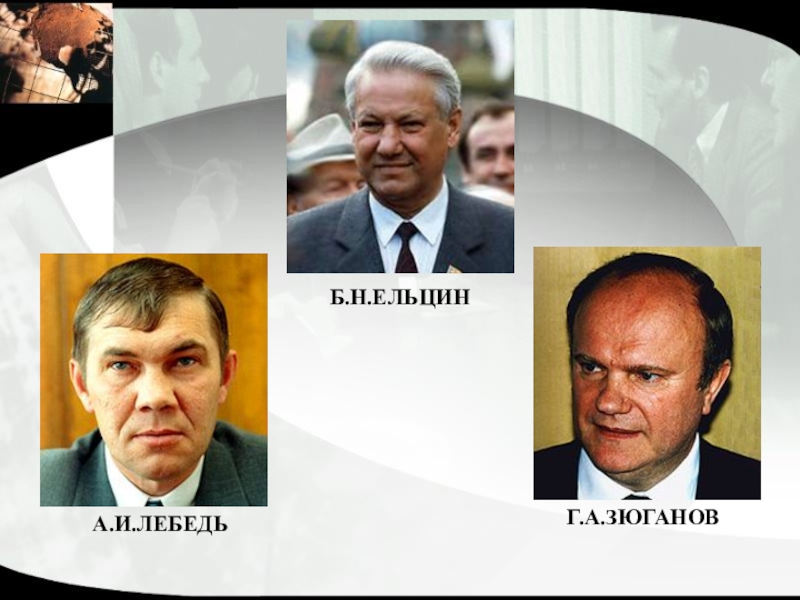 В первом туре выборов Б.Н. Ельцин занял первое место, получив 35 % голосов избирателей. Лидер КПРФ ГА. Зюганов обеспечил себе 32 % голосов, на третье место (15 %) вышел генерал А.И. Лебедь. Он выступал в роли человека твердой руки, который стоит вне межпартийного соперничества и для которого превыше всего интересы России.