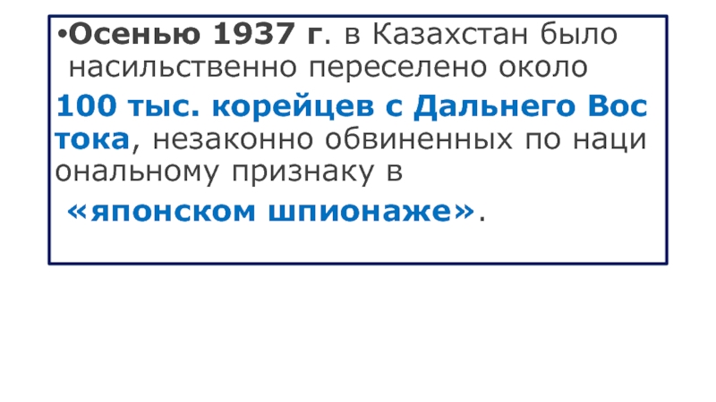 Слайд 8Осенью 1937 г. в Казахстан было насильственно переселено около