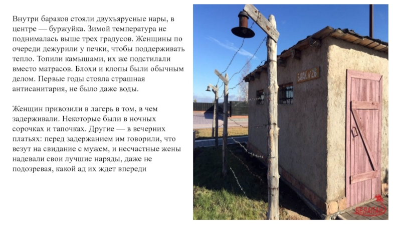 Слайд 15Внутри бараков стояли двухъярусные нары, в центре — буржуйка. Зимой