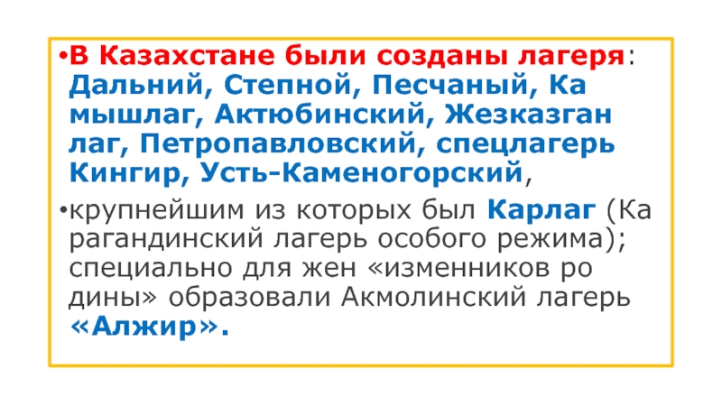 Слайд 7В Казахстане были созданы лагеря: Дальний, Степной, Песчаный, Камышлаг, Актюбинский,