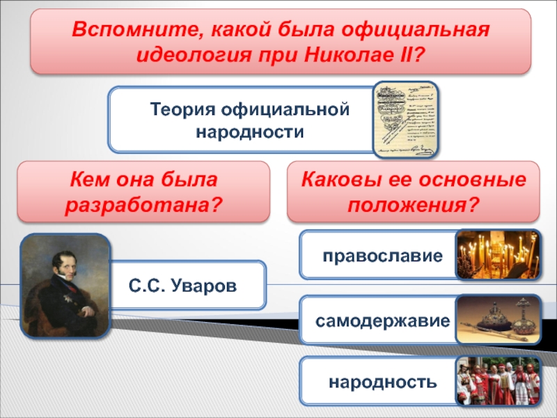 Слайд 27Вспомните, какой была официальная идеология при Николае II?