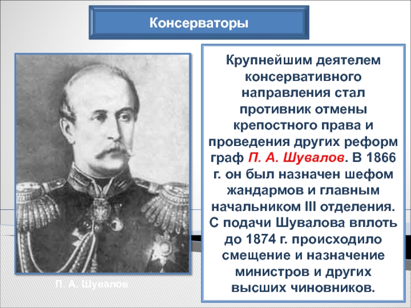 он был назначен шефом жандармов и главным начальником III отделения. С подачи Шувалова вплоть до 1874 г. происходило смещение и назначение министров и других высших чиновников.
