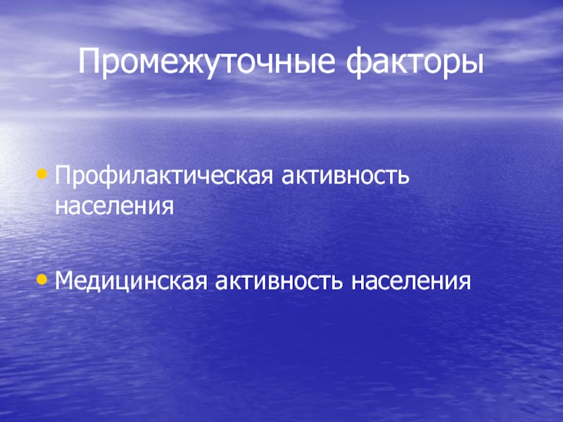 Промежуточные: поведенческие – факторы образа жизни - профилактическая и медицинская активность населения.