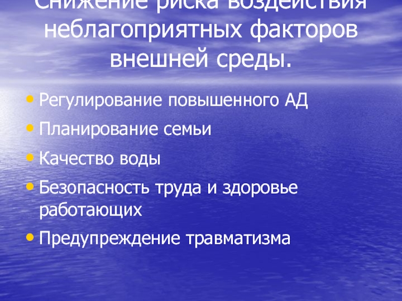 Слайд 16Снижение риска воздействия неблагоприятных факторов внешней среды.