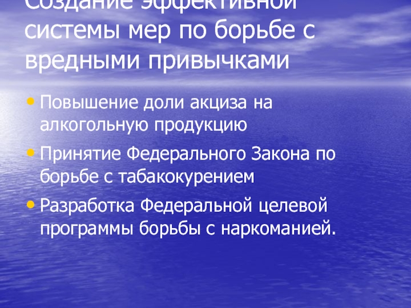 Слайд 11Создание эффективной системы мер по борьбе с вредными привычками
