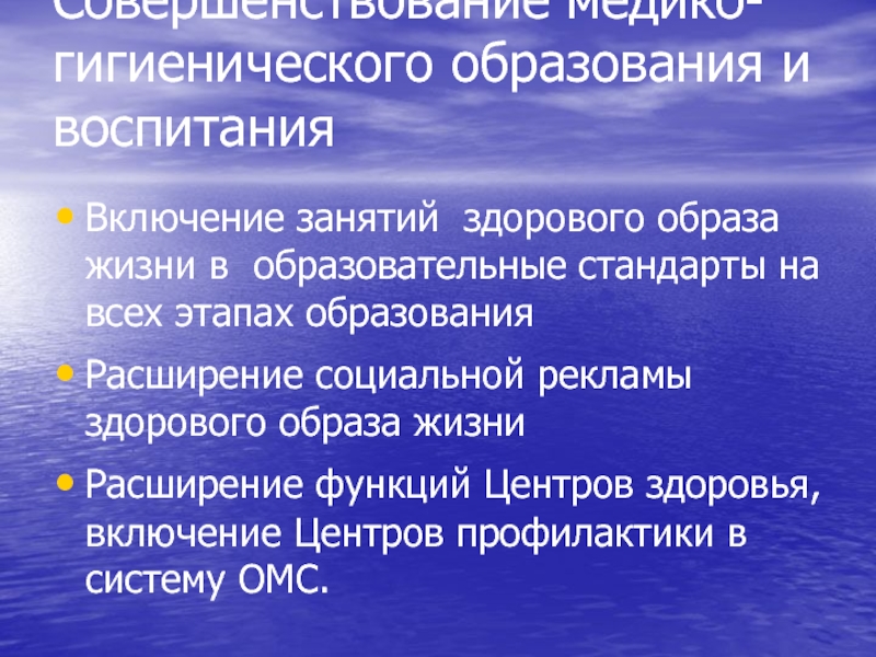 Слайд 10Совершенствование медико-гигиенического образования и воспитания