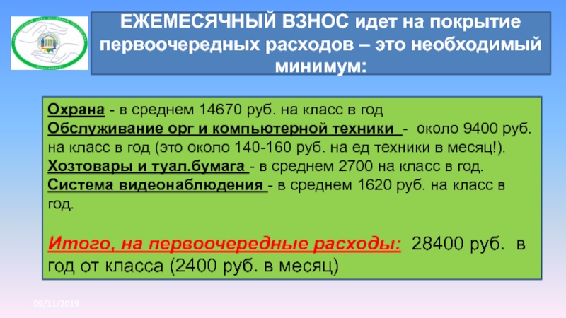 Итого, на первоочередные расходы: 28400 руб. в год от класса (2400 руб. в месяц)