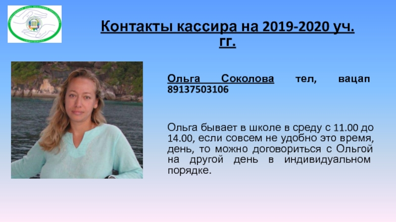 Слайд 19Контакты кассира на 2019-2020 уч. гг.