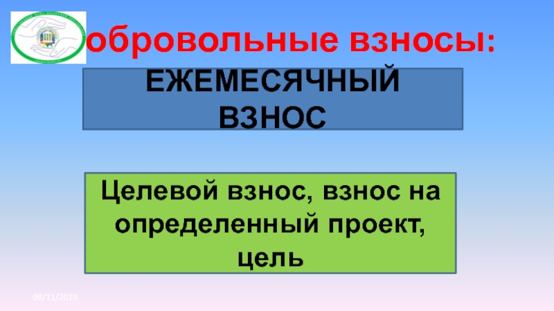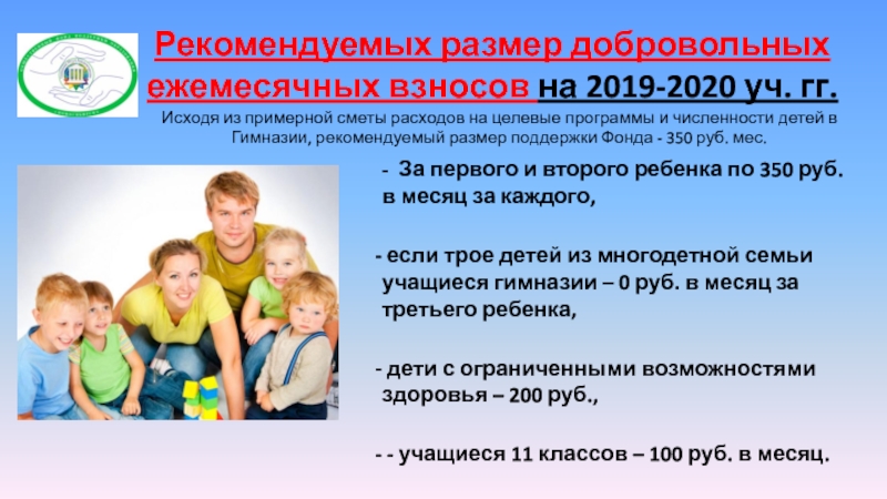 Слайд 7Рекомендуемых размер добровольных ежемесячных взносов на 2019-2020 уч. гг.