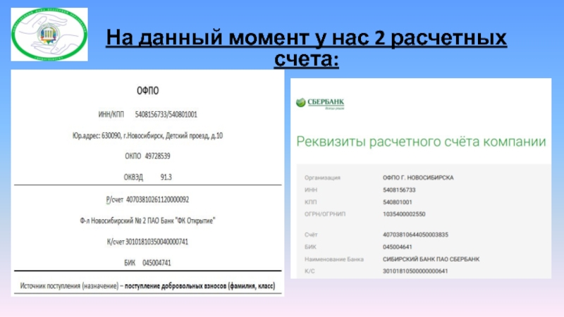 Слайд 20На данный момент у нас 2 расчетных счета: