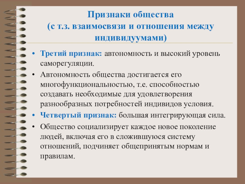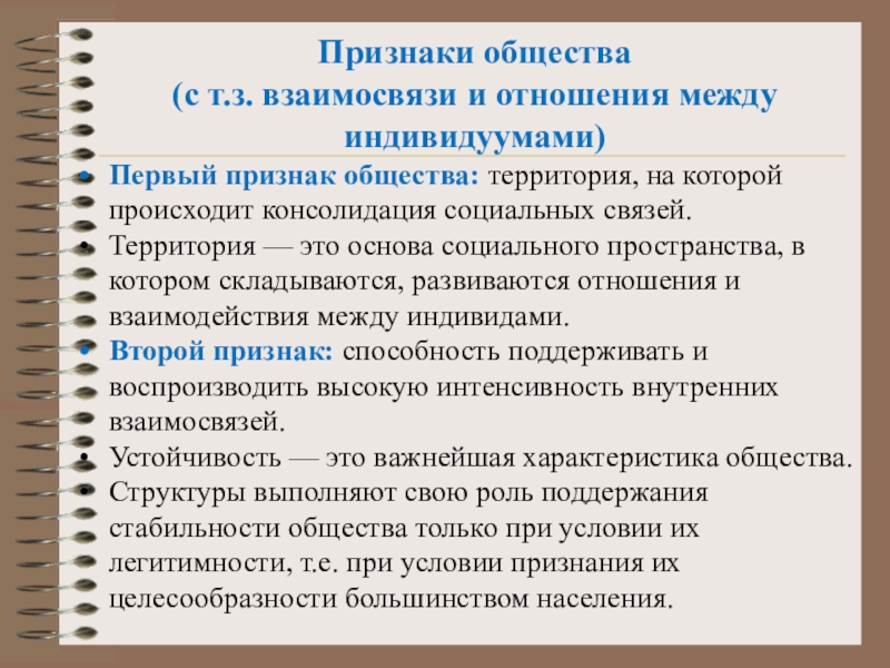 Признаки общества: постоянная территория; пополнение общества главным образом благодаря деторождению; развитая культура; политическая независимость.