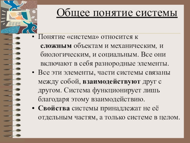Все эти элементы, части системы связаны между собой, взаимодействуют друг с другом. Система функционирует лишь благодаря этому взаимодействию.