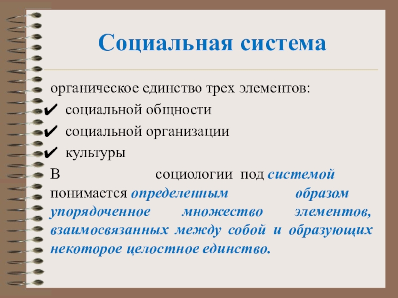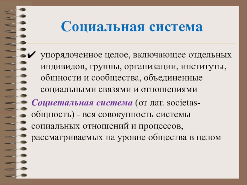 упорядоченное целое, включающее отдельных индивидов, группы, организации, институты, общности