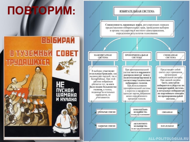 http://foxford.ru/wiki/obschestvoznanie/izbiratelnye-sistemy - конспект лекции и проверочный тест по теме «Избирательные системы».