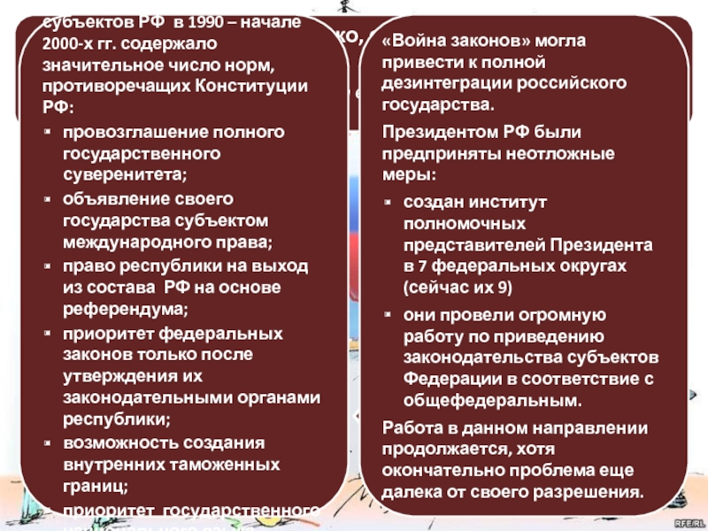 Законодательство многих субъектов РФ в 1990 – начале 2000-х гг. содержало значительное число норм, противоречащих Конституции РФ: