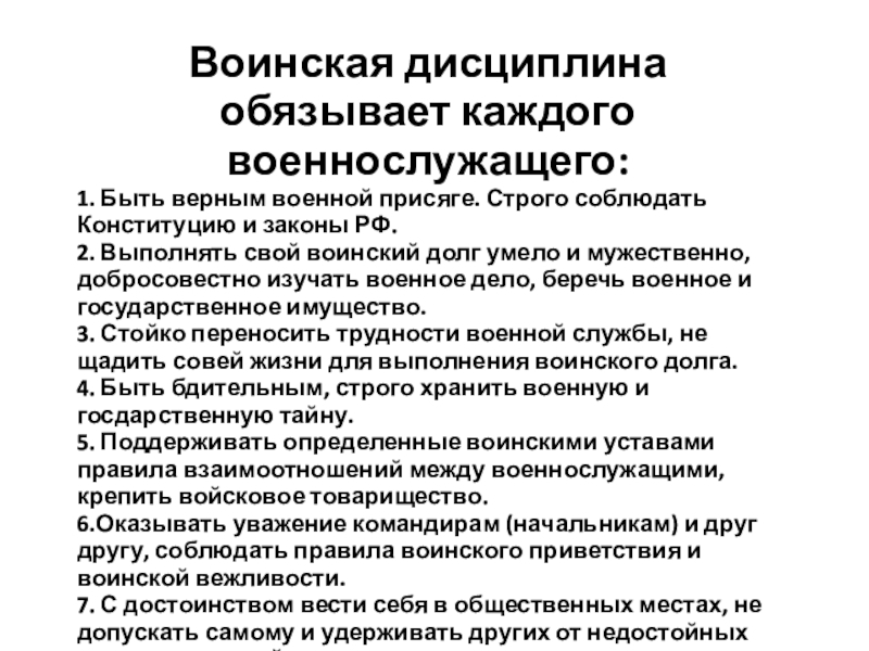 Воинская дисциплина обязывает каждого военнослужащего:1. Быть верным военной присяге. Строго соблюдать Конституцию и законы РФ.2. Выполнять свой