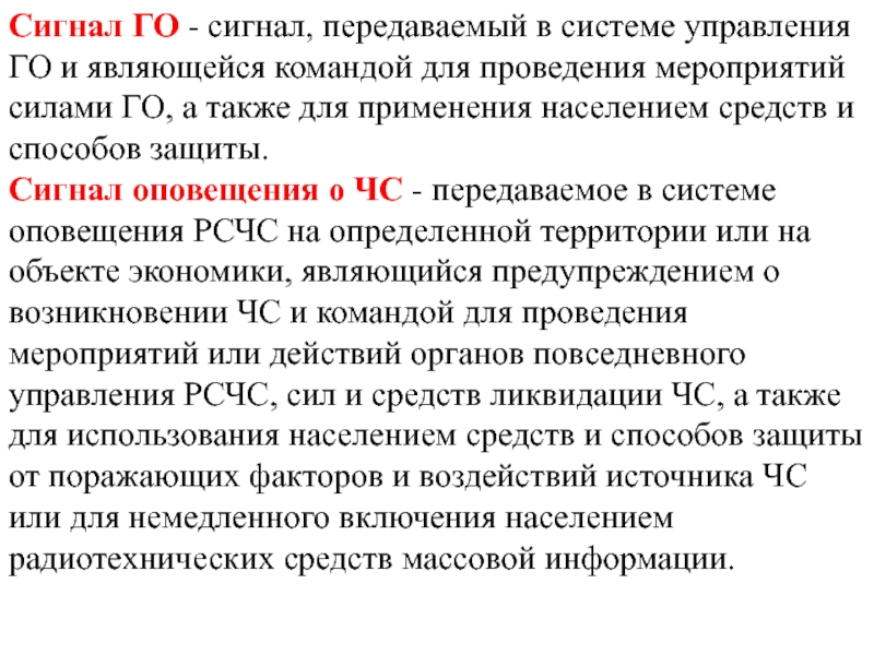 Сигнал оповещения о ЧС - передаваемое в системе оповещения РСЧС на определенной территории или на объекте экономики, являющийся предупреждением о возникновении ЧС и командой для проведения мероприятий или действий органов повседневного управления РСЧС, сил и средств ликвидации ЧС, а также для использования населением средств и способов защиты от поражающих факторов и воздействий источника ЧС или для немедленного включения населением радиотехнических средств массовой информации.