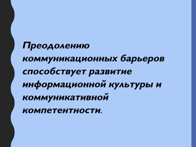 Преодолению коммуникационных барьеров способствует развитие информационной культуры и коммуникативной компетентности.