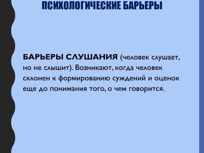 БАРЬЕРЫ СЛУШАНИЯ (человек слушает, но не слышит). Возникают, когда