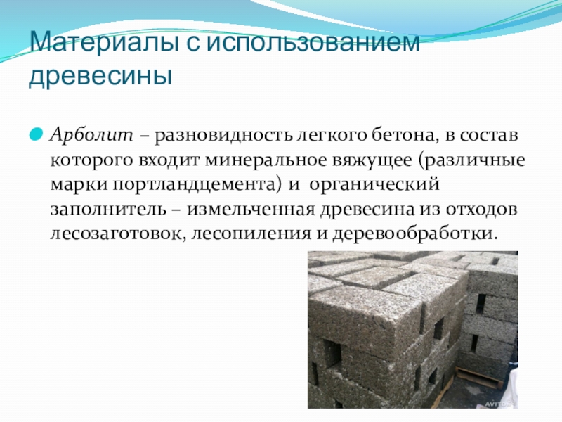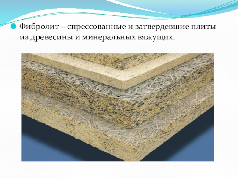 Слайд 44Фибролит – спрессованные и затвердевшие плиты из древесины и минеральных