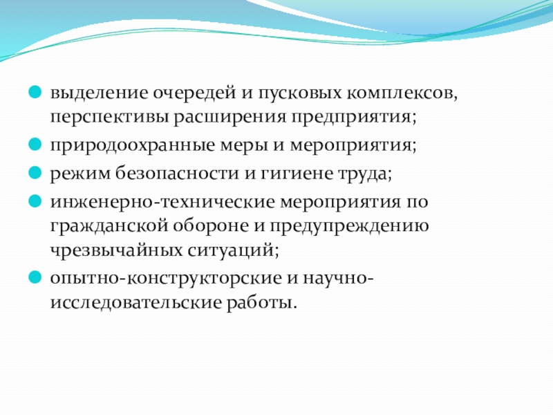 Слайд 12выделение очередей и пусковых комплексов, перспективы расширения предприятия;