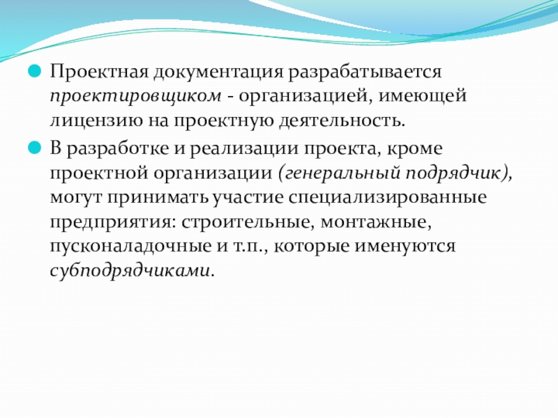 Слайд 5Проектная документация разрабатывается проектировщиком - организацией, имеющей лицензию на проектную