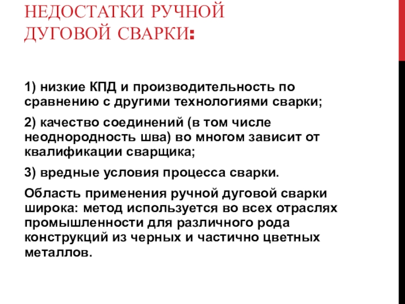 Область применения ручной дуговой сварки широка: метод используется во всех отраслях промышленности для различного рода конструкций из черных и частично цветных металлов.