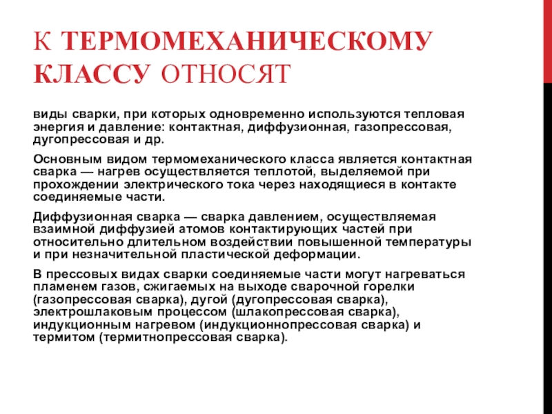 термомеханического класса является контактная сварка — нагрев осуществляется теплотой, выделяемой при прохождении электрического тока через находящиеся в контакте соединяемые части.