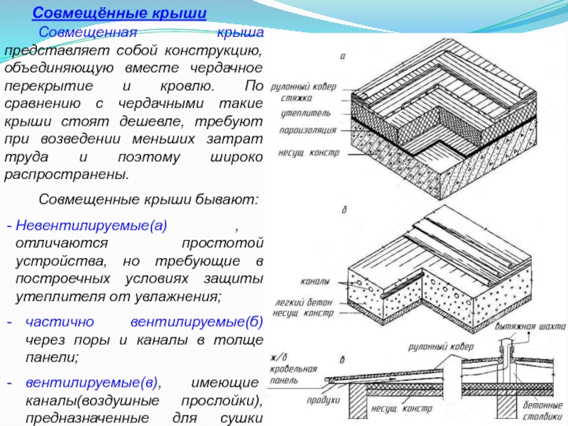 вентилируемые(в), имеющие каналы(воздушные прослойки), предназначенные для сушки утеплителя и предупреждения вздутий рулонного ковра кровли.