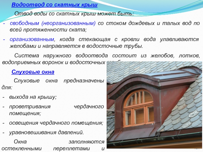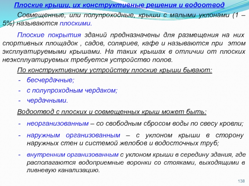 Слайд 138Плоские крыши, их конструктивные решения и водоотвод