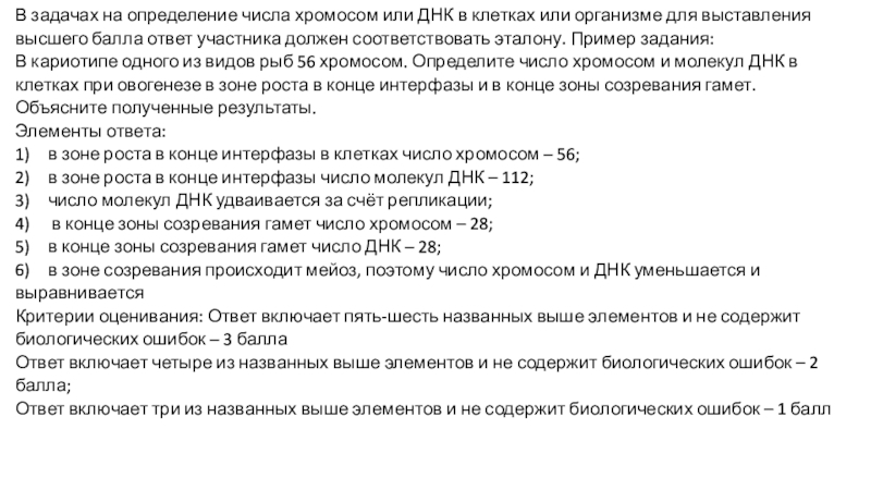 эталону. Пример задания:В кариотипе одного из видов рыб 56 хромосом. Определите число хромосом и молекул ДНК в клетках при овогенезе в зоне роста в конце интерфазы и в конце зоны созревания гамет. Объясните полученные результаты.