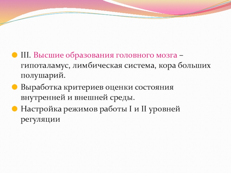 Слайд 13III. Высшие образования головного мозга – гипоталамус, лимбическая система, кора