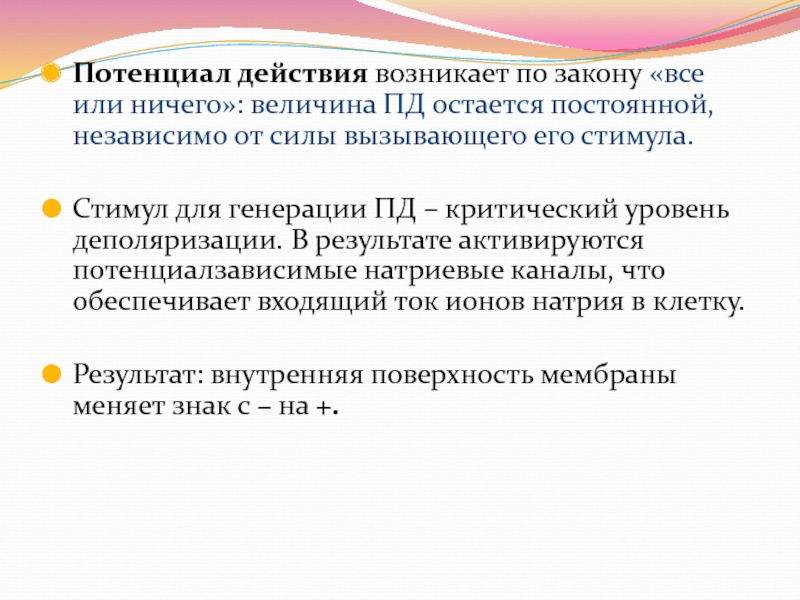 Слайд 28Потенциал действия возникает по закону «все или ничего»: величина ПД